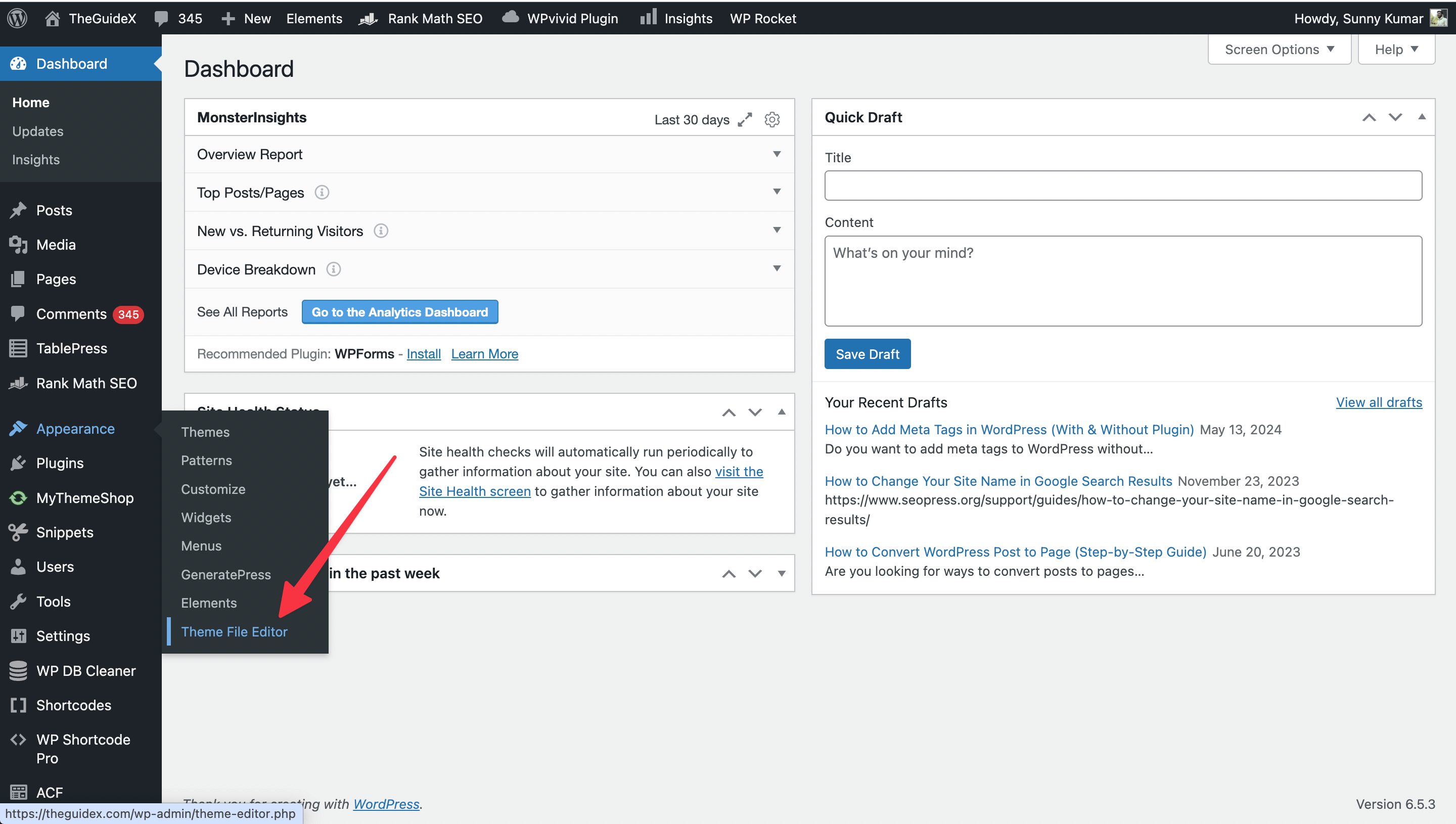 - Go to “Appearances” and then “Theme File Editor.”