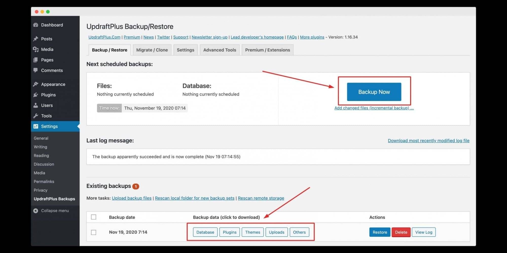 After you install the plugin, you need to set it up and create a backup. To configure the plugin, go to the Settings menu and click on UpdraftPlus Backups. You will then be taken to the plugin’s configuration page.
