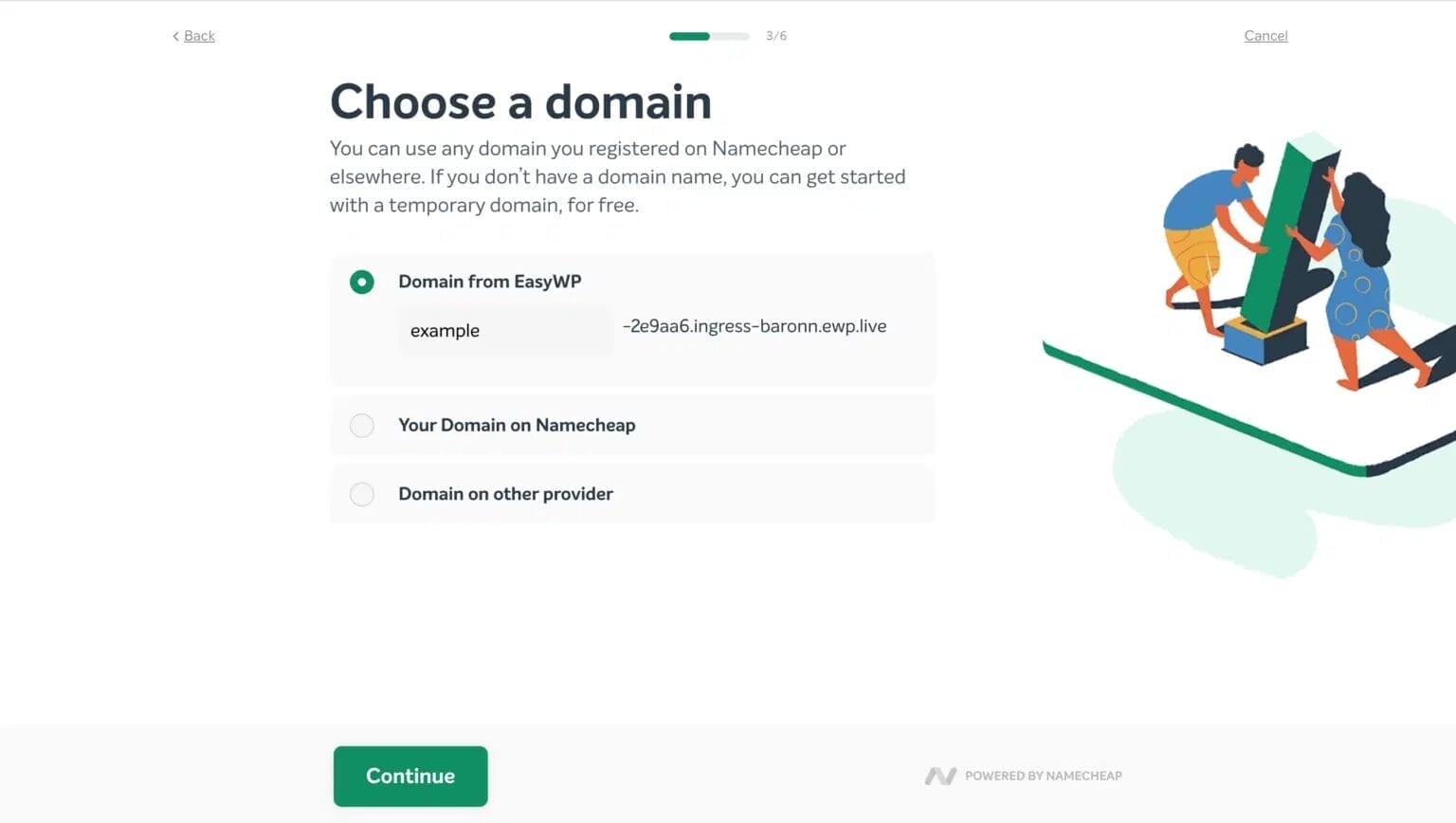 Choose the domain of your website. By doing so, you will be provided with several options to select from, such as using a free subdomain or picking one of the packages offered by Namecheap (or any other domain provider).