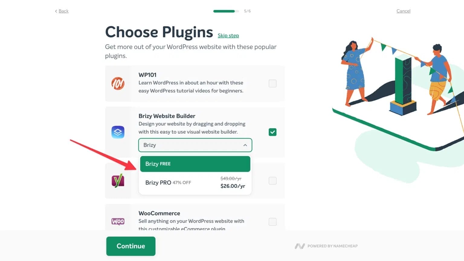 When you click ‘Continue,’ a screen with plugin options will appear. Choose to install these plugins or skip this step as well. Remember about the discounts available for certain plugins. I’ll select Brizy for demonstrating, but you can choose any one of your choices.