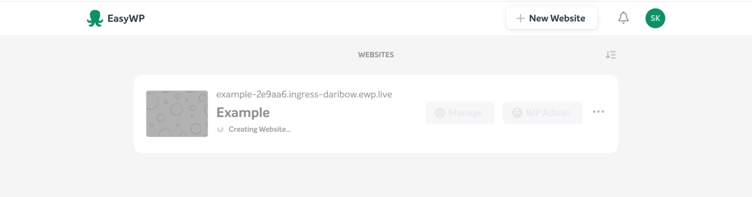 Once that’s complete – you have officially bagged your EasyWP hosting at a neat little discount. Want to rule your kingdom? Click WP Admin, or if you want to try out more settings, click Manage.