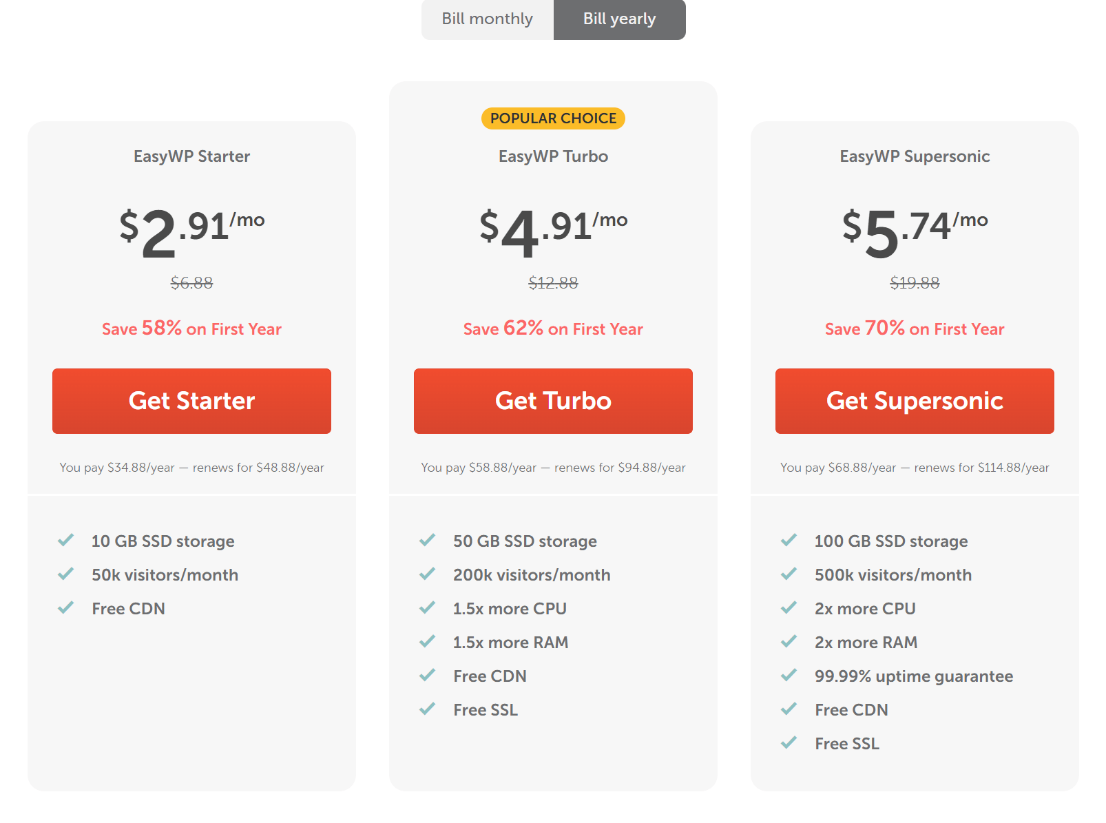 EasyWP has three different pricing points, including Starter, Turbo, and Supersonic.
