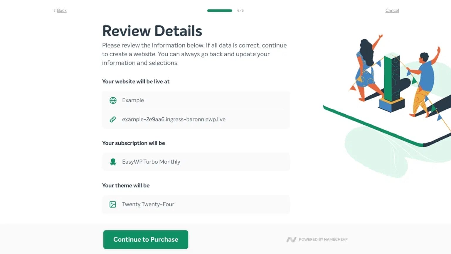 Double-check all the details you have provided, particularly the subject’s name and address of your website, the type of plan and pricing chosen by you, as well as the theme along with plugins. After confirmation, you can go ahead to ‘Continue To Purchase’.