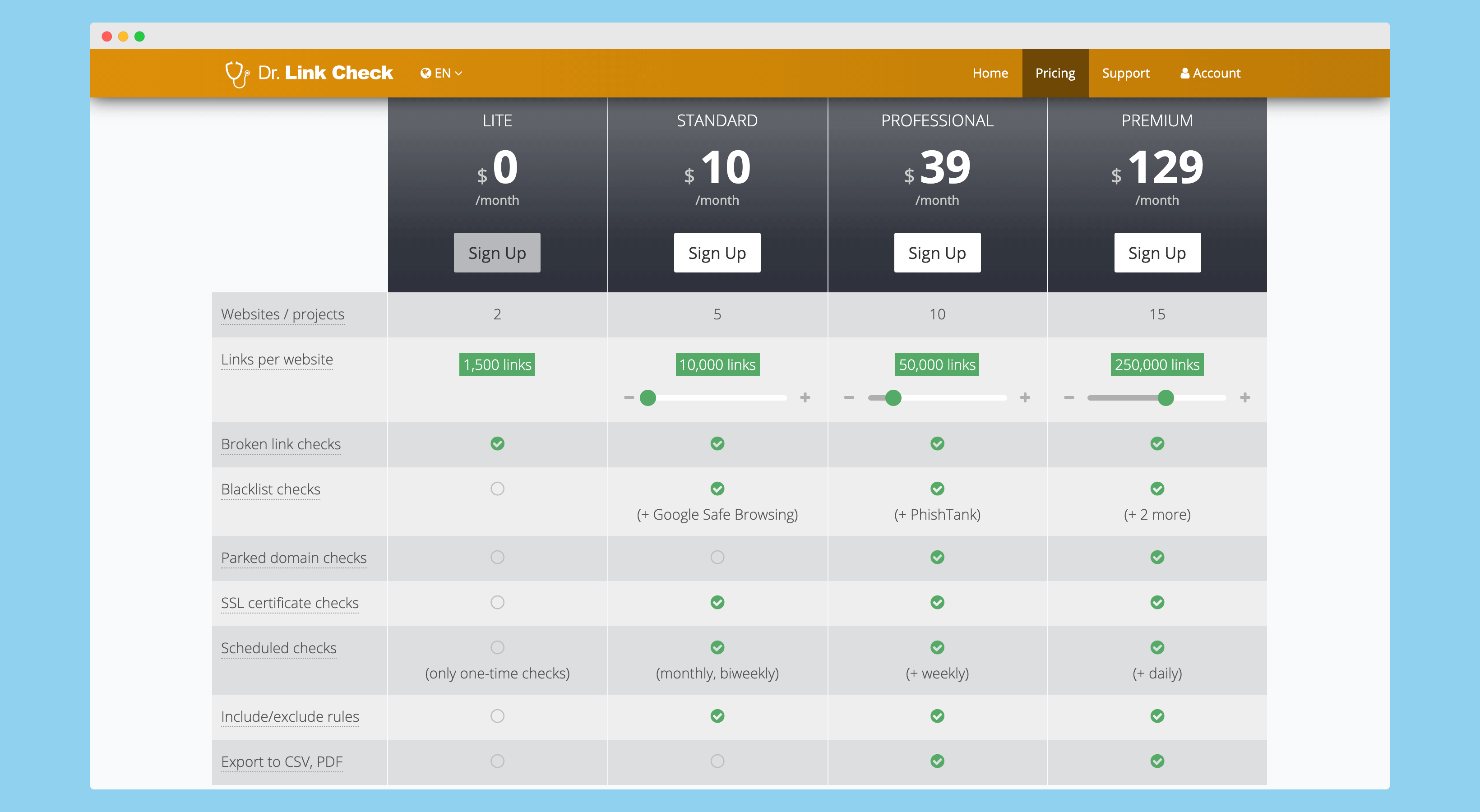 In starting, you can choose the “Lite” plan, which costs you nothing for testing the features, and then shift to some other plans for in-depth analysis. I’m on their “Professional Plan”, which comes with a Broken links check, PhishTank, SSL Check, Parked Domain check, and a lot more features.