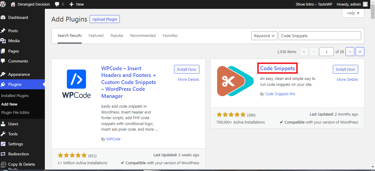 Follow the method prescribed in the above paragraph to search for the “Code Snippets” plugin and activate it.