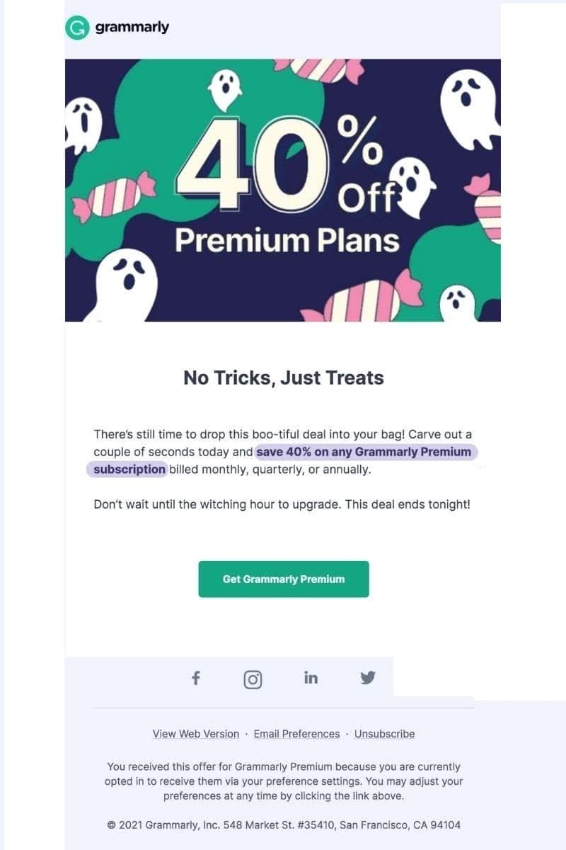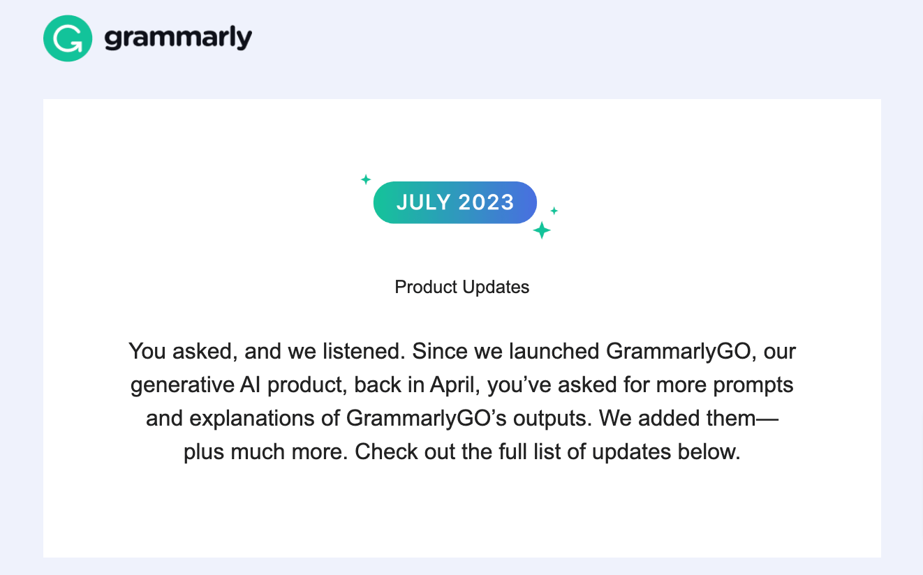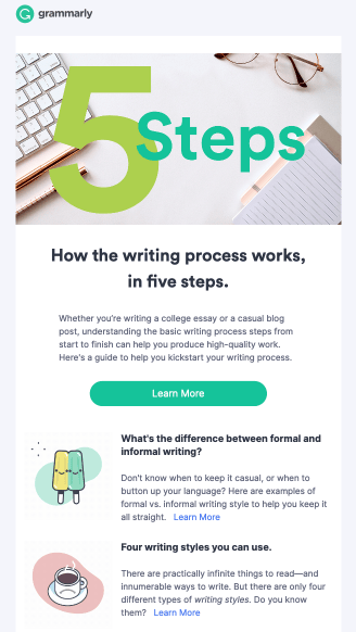 Grammarly, for instance, sends a mix of writing tips, product updates, and special offers to subscribers with its newsletters: