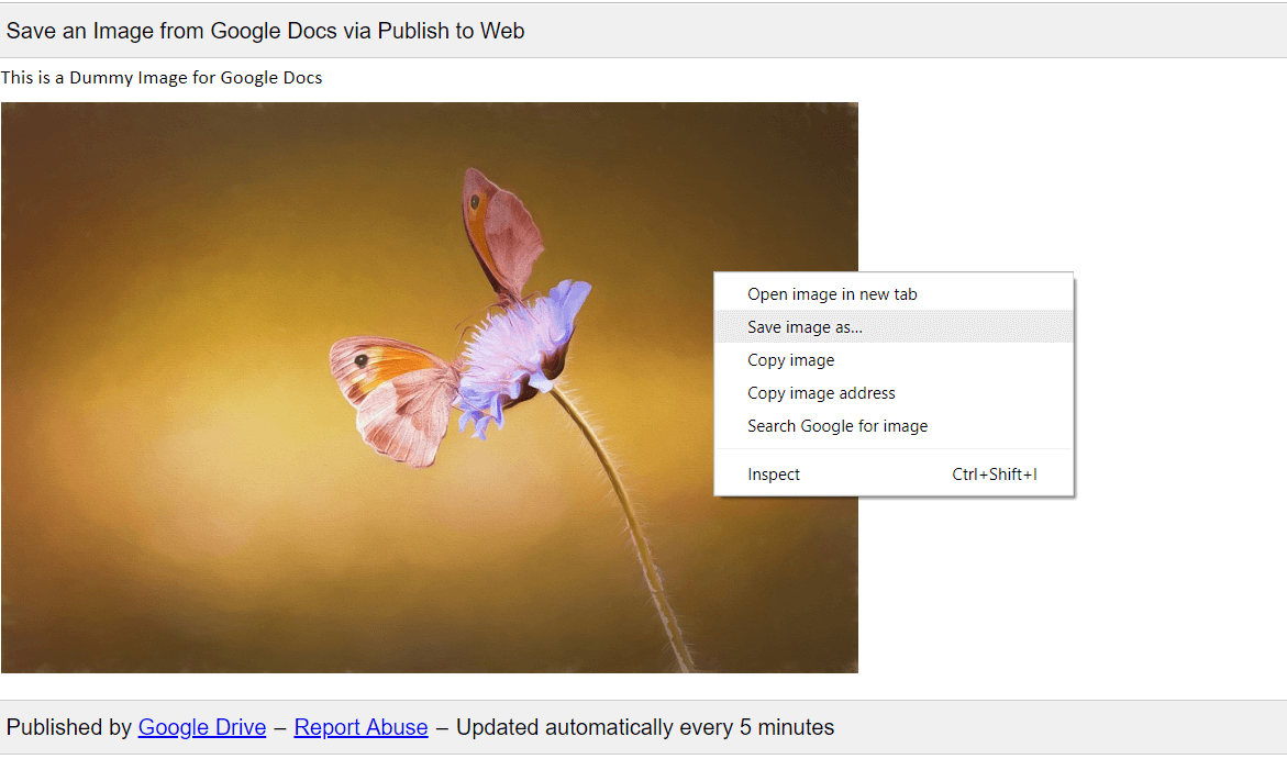 After you paste your link to the address box, you’ll see a webpage published version of your document. Hover over the image, right-click, and click on “Save as image.” Before saving your image, provide an appropriate name for your image for SEO purposes.