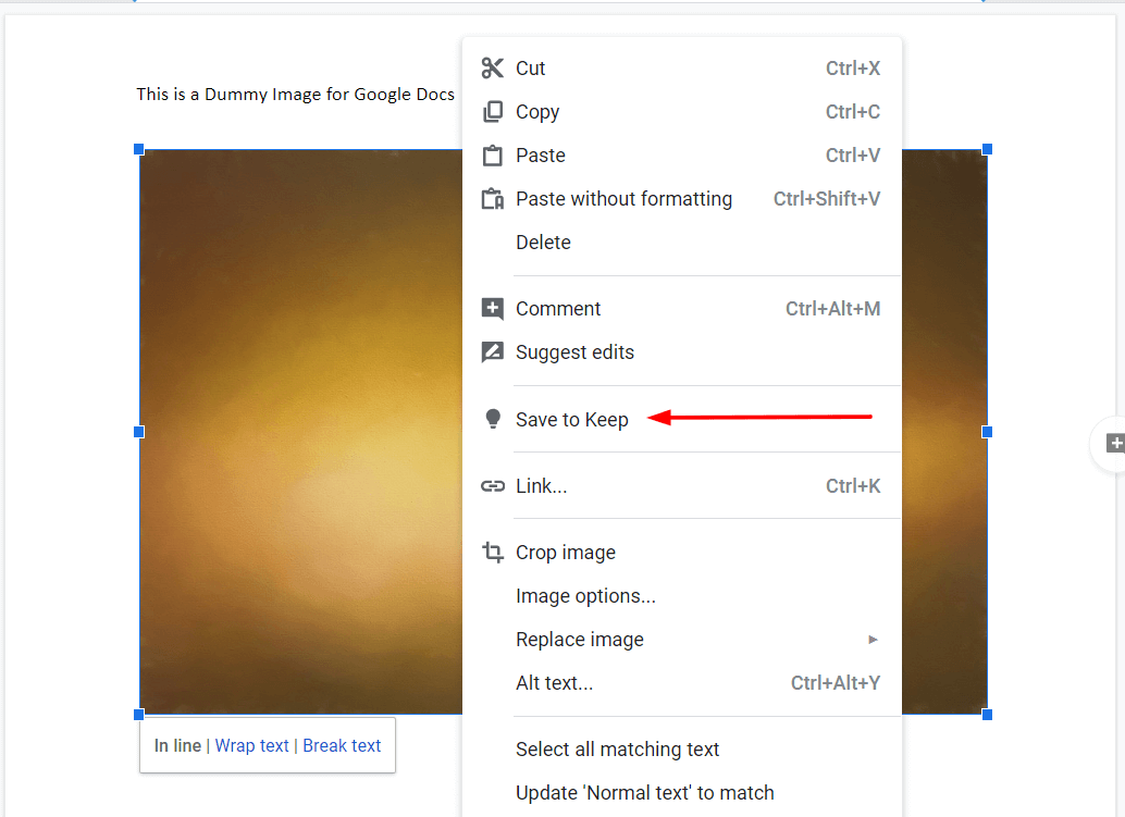 First, open your document and select the desired image you want to save. After selecting your image, right-click on the image and click on “Save to Keep Notepad“.
