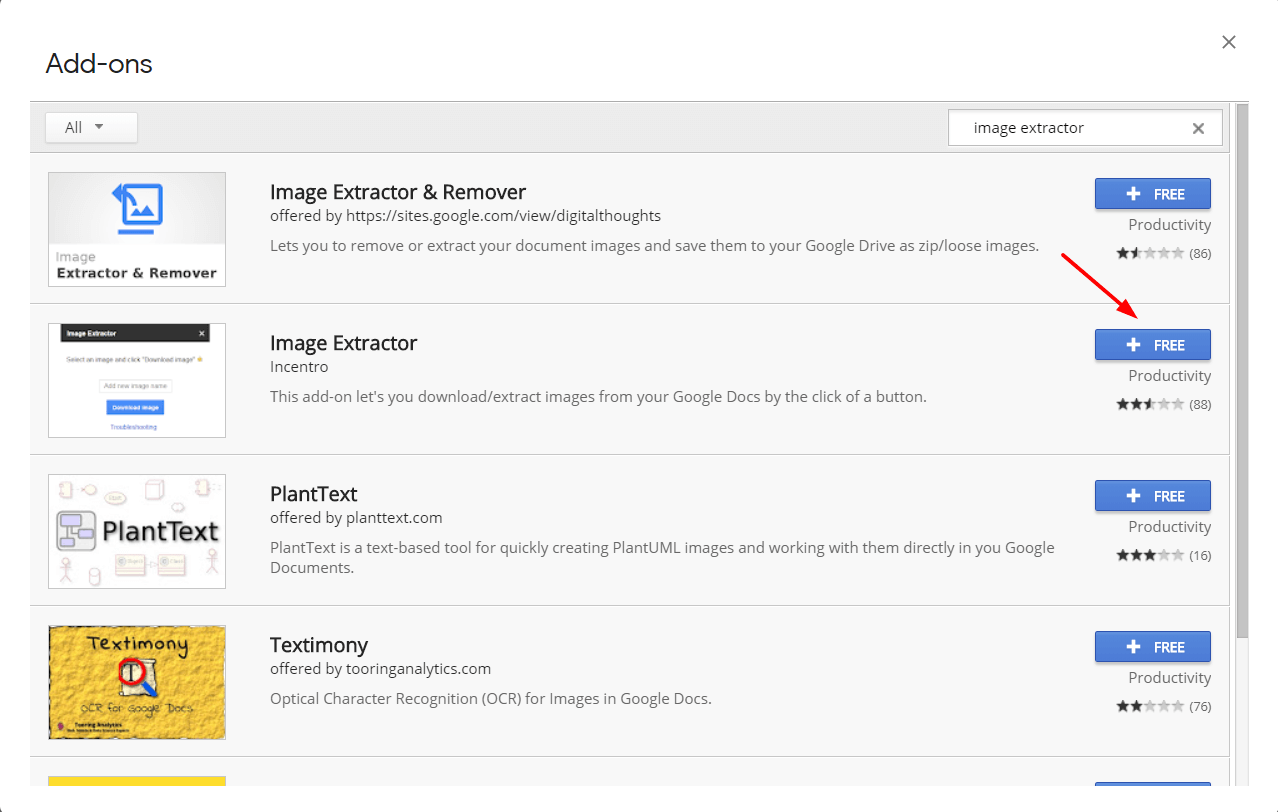First of all, you have to get an add-on named “Image Extractor” to start using this step. to install this extension, open your docs file and click on add-ons > Get add-ons > search image extractor > install. This method will help you to install the image extractor extension in your Google Docs which allows you to save an image from Google Docs.