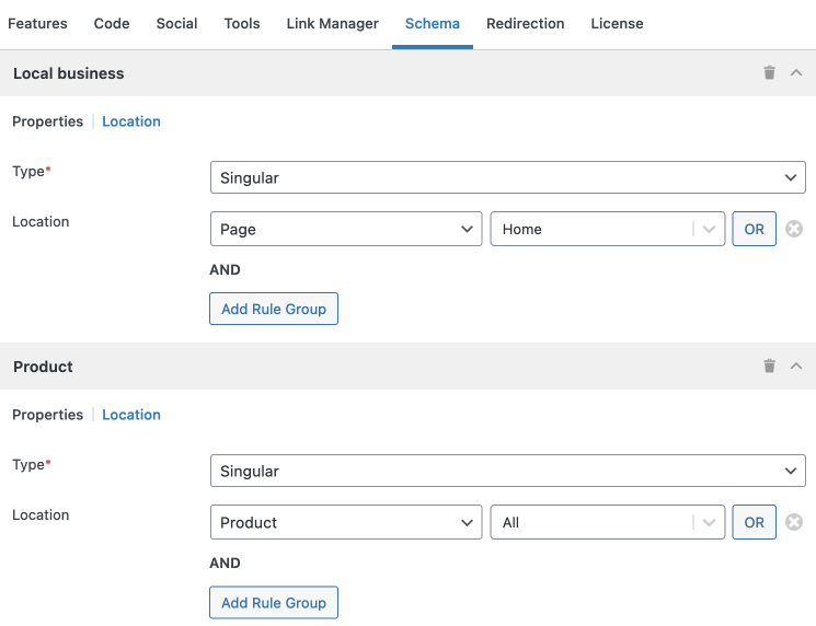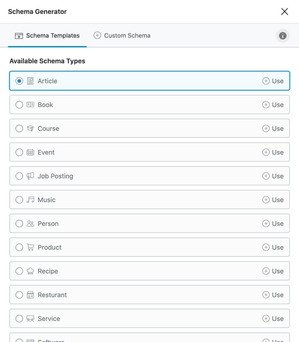 Slim SEO provides basic schema markup, focusing on the most common types like Article, Product, and FAQ. While it doesn’t offer the extensive options that RankMath does, it ensures that your content has essential structured data without any manual configuration.