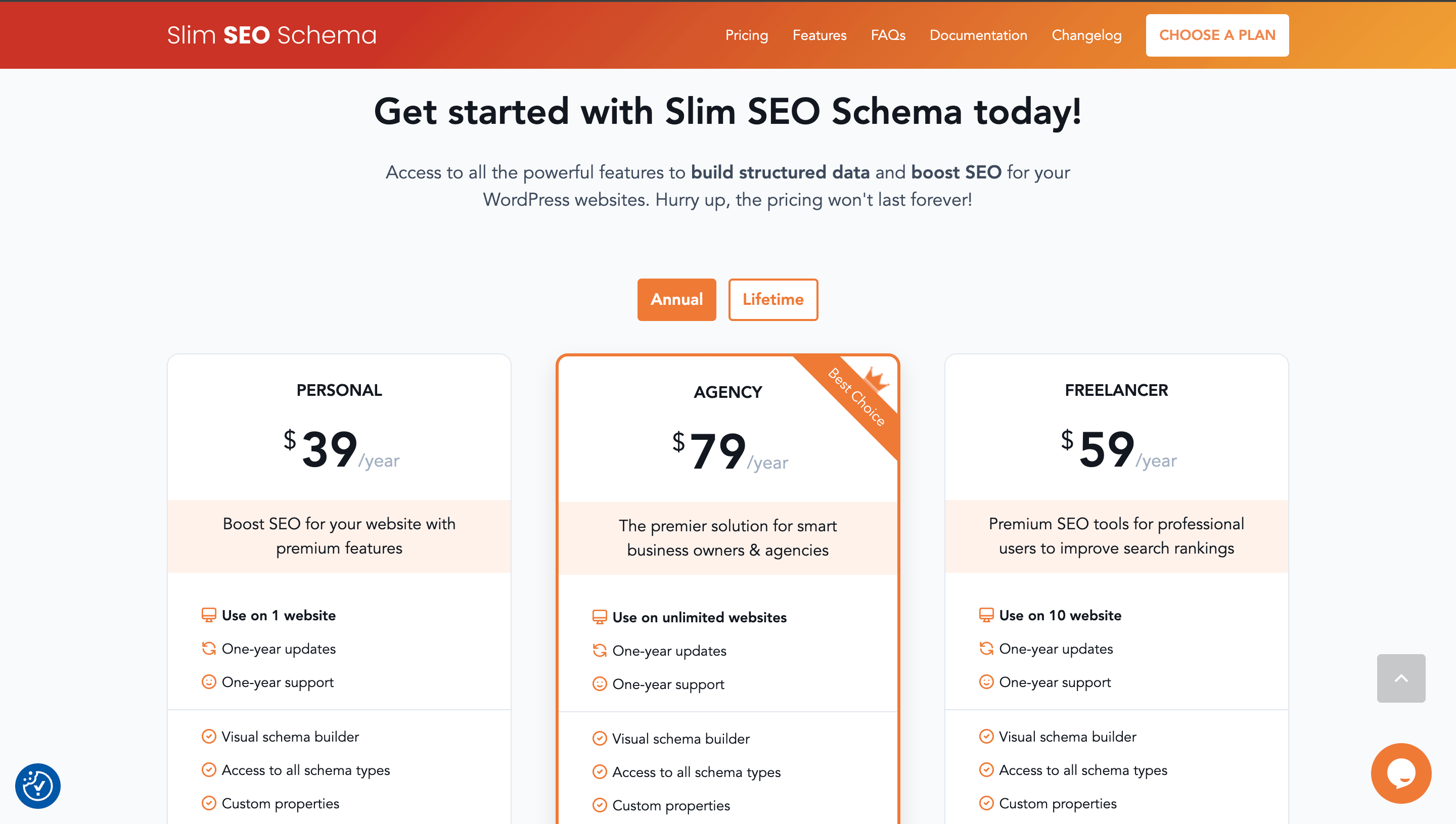 Slim SEO Schema offers three annual plans and three lifetime plans: