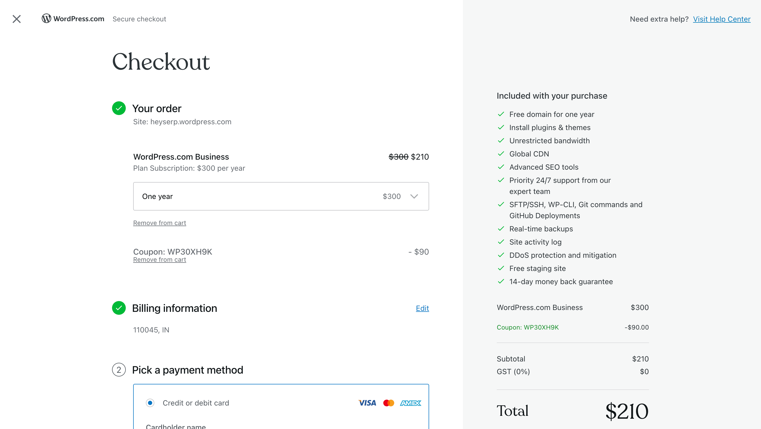 If you’re purchasing WordPress.com managed hosting plans, you need to enter the coupon code shared above on the checkout page. It will immediately apply the discount to your order, reducing the total cost of your selected hosting plan.