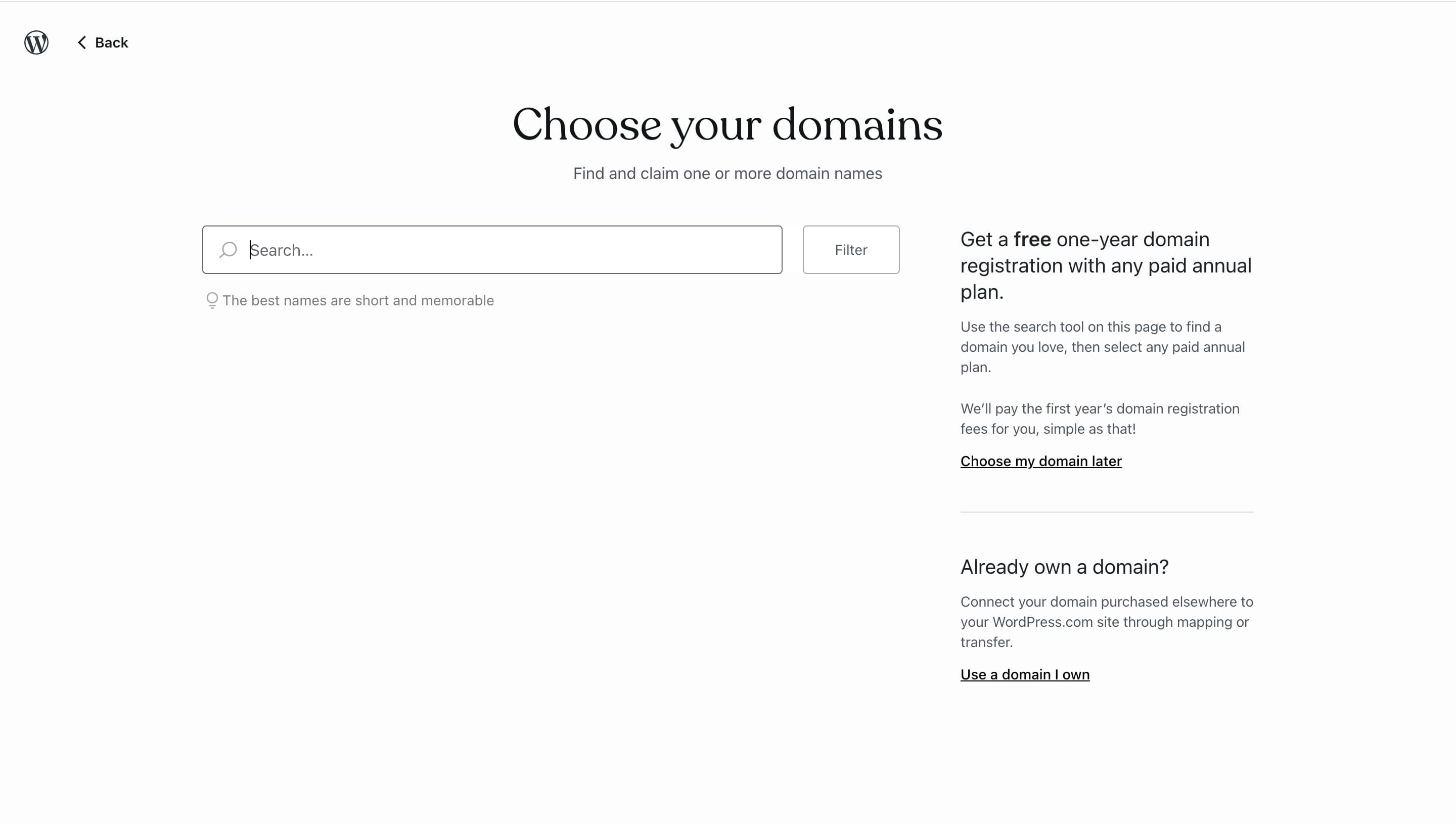 Step 3: You will now be asked to choose a domain name. If you already have a domain name in mind, you can search for it and add it to your cart or click on the “Choose my domain later” option to select it later.